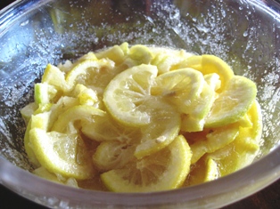 ●薄くスライスしたレモンに、グラニュー糖、蜂蜜を入れて混ぜ、しばらく置きます。