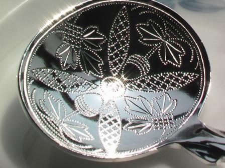 適度な重みと銀メッキの輝きが美しいティースプーンです。