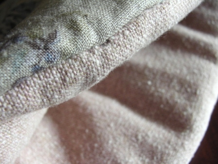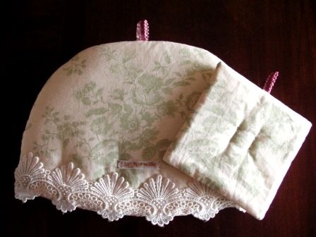 ヴィンテージリネンを使ったコージーはレトロな雰囲気。