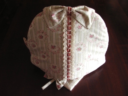 雑貨屋さんのイメージに合わせて作ったリボンとレースのコージー。