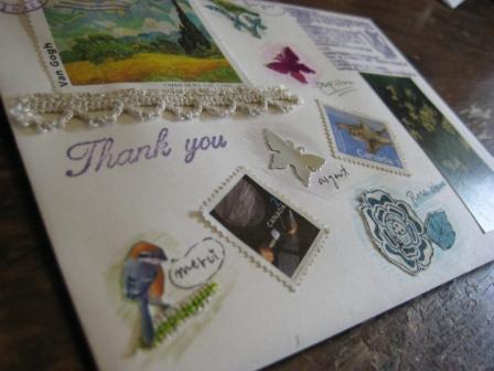 その封筒が真っ白で、なにか古切手でも貼ろうかな、と思いつくままに貼っていくうちに、