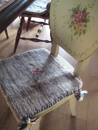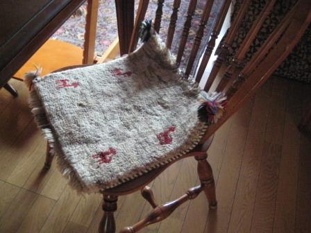 小さめのキリム絨毯なのですが、いすの上に1枚敷くと、ワンランクアップした座り心地になるのですよ。