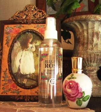 ローズウォーターのとなりにある、バラのモチーフが描いている容器は、実は香水のビンです。
