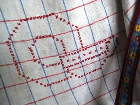 こちらはヴィンテージのコットンリネンクロスに、ティーカップをクロスステッチしたもの。